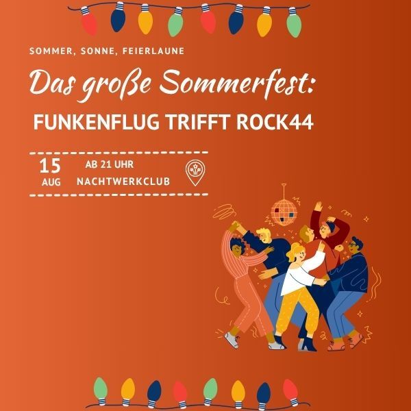 Nach dem großartigen Erfolg im letzten Jahr freuen wir uns ganz besonders auf das Funkenflug Sommerfest 2025! Gemeinsam mit Rock44 wollen wir mit dir den Sommer, die Liebe und das Leben feiern!