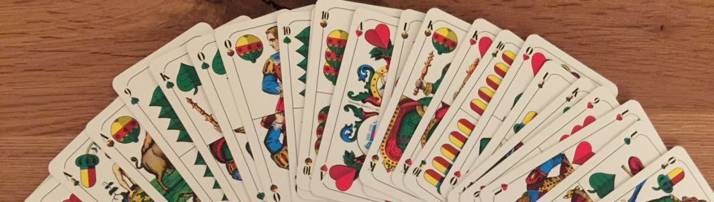 Wir spielen (Farb)Wenz und (Farb)Geier, Rufspiel (10 Cent), Soli (20 Cent), Laufende je 10 Cent, Kontra/Re (Übernehmende Partei muss dann mind. 61/31 Augen haben um zu gewinnen bzw. schneiderfrei zu sein), Stock oder evtl. auch Ramsch (mit Durchmarsch ab 91 Augen). Spiel-Rangfolge: Rufspiel-Farbgeier-Farbwenz-Geier-Wenz-Solo (Schell-Eichel-Blatt-Herz).